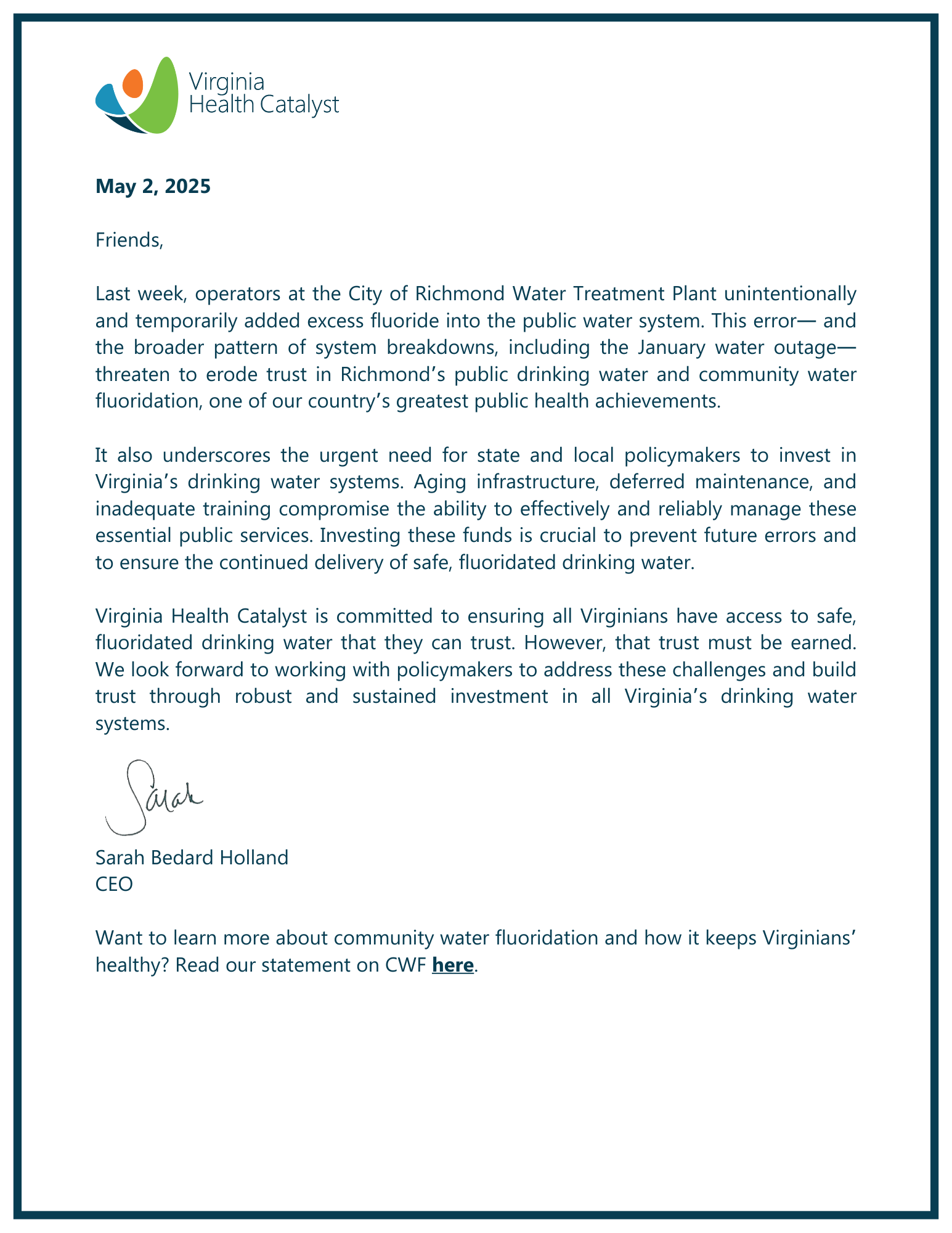 Community water fluoridation (CWF) is a public health intervention that makes fluoride accessible to everyone. Catalyst works to ensure proper fluoridation in Virginia's public drinking water so everyone can access this inexpensive and effective intervention.